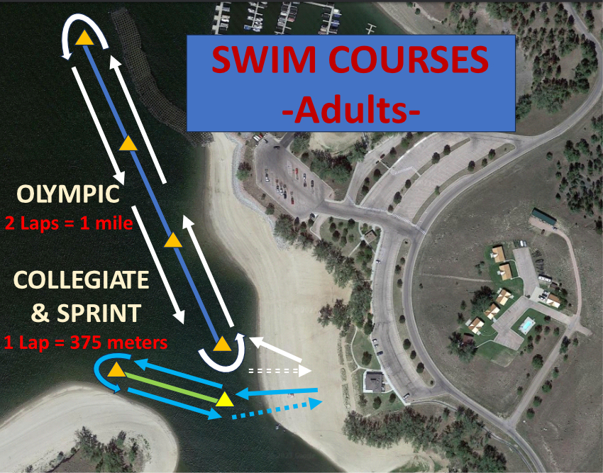 BIKE: Riders will proceed through the recreation area and head either 12 miles out towards Oral or 6 miles out east (depending on the Olympic vs Sprint distance) across US Hwy 385 on rolling hills, black top roads. The roads are not closed, so watch for vehicles on the road. * COLLEGIATE racers will bike out 5K (turn around at the entrance of The Lodge, and head back toward transition (total of 10K). Bike helmets are required. There will be volunteers assigned to the turn around near The Lodge and at US Hwy 385 crossing for your safety. BIKE IN Transition Area will be the same location as BIKE OUT, Be sure to exit on the BIKE OUT side and enter on the BIKE IN side of the mats.